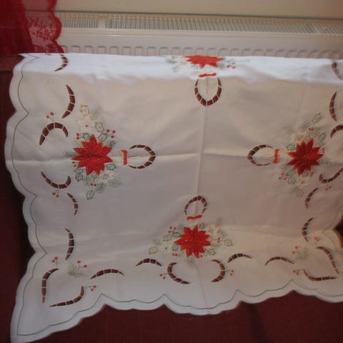 Jule- sjal, duk eller gardiner. Samlet 250,-