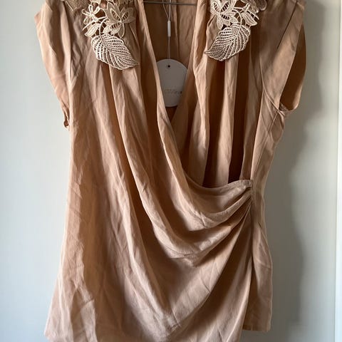 Dette er virkelig en festtopp. Stoffet i tykk silke, med drapert bred blonde med perler påsydd. Glidelås i siden. Str small. Merket er Just in Case, et nederlandsk design og søm firma med små kolleksjoner. Pris ny var 2.200,-