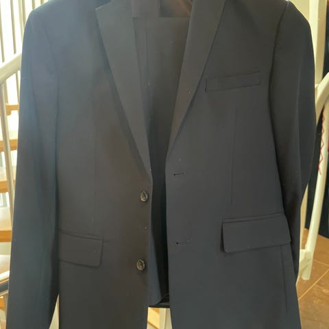 Mørk blå dressjakke for ungdom. Lite brukt, men har noen bruksmerker på høyre armen. De er veldig små, men jeg ville påpeke på den.