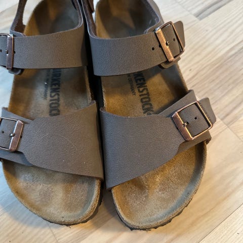 Birkenstock barnesandal i størrelse 33, unisex modell. Sandalen har svart/blå farge og to justerbare spenner. Sålen er laget for komfort og støtte.