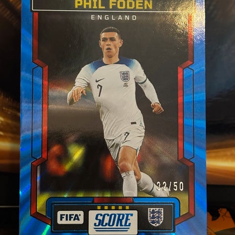 Panini Top-Glasses Phil Foden fotballkort med bilde av spilleren i Englands landslagsdrakt. Kortet viser spillerens navn, nummer 7, og statistikk som antall kamper (29) og mål (4). Kortet har en holografisk finish og inkluderer informasjon om spillerens popularitet på sosiale medier.