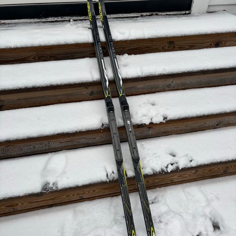 Skiene er godt tatt vare på, det samme er skoene.