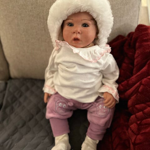 53 cm høy. Naturhår sydd på hodet, kan styles som man ønsker. Kroppen har synlige blodårer malt på. Alle klær på bildene, er inkludert. Leveres i eske, passer som gave. Pleies forsiktig.