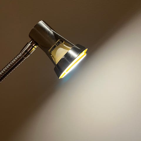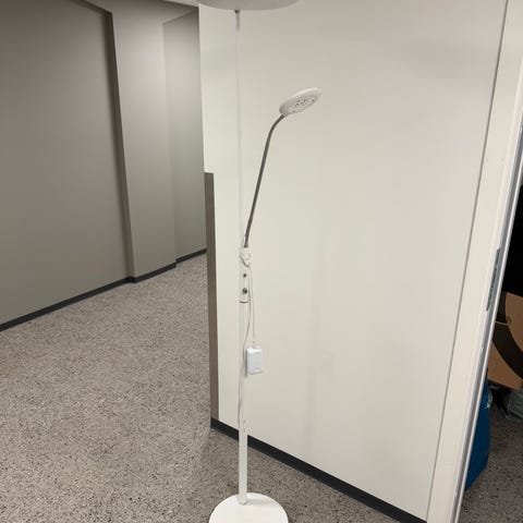 Gulvlampe for 2 spotlys. Strømledningen har en hovedbryter. På selve lampen er det en variabel skrubryter for lysstyrke. Skrubryteren mangler en ekstra knott, men virker helt fint.