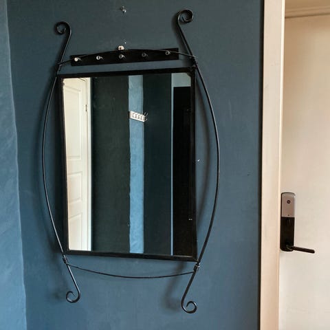Fint sort speil med skinn rem. Må hentes. 41 cm rett over. Butikkpris var 799kr.