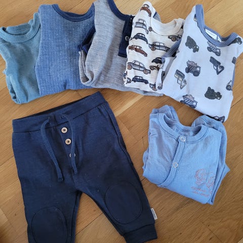 Liten klespakke med body fra KappAhl i 100% ull og bukse fra Hust&Claire i ull/bambus🧸 Buksen har noen små bruksmerker som vist på bildene. Str. 62. Vil si begge plaggene er normale til litt store i størrelsen.