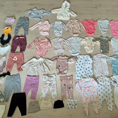 Pakke inneholder bla 5 bodier, 2 fullbody, tre myke dress i forskjellige tykkelse (til kaldere og varmere vær), 2 pene kjoler, 2 sommer jumpsuit. Luer, sommerhatt og sokker i tillegg.