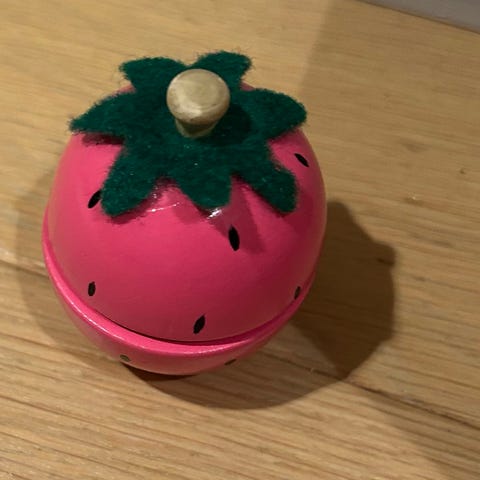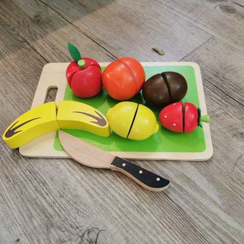Flott kake i tre med kniv og skjærebrett samt jordbær å feste og dekorere.