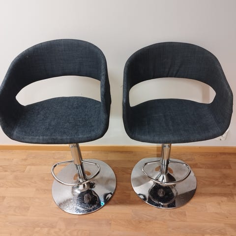 Barstoler med sete i mørkt materiale, 4 stykker, synlig brukt. Rammen er laget av tre. Passer til bruk som sitteplass ved barbord, er behagelige å sitte på. Pris for 4 stoler samlet, og 40 kroner per stol.