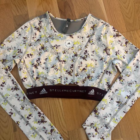 Adidas Stella McCartney treningsbukse også kjent som piratbukse, for dame i størrelse S. Bukser i grå farge laget for fitnessaktiviteter. Materialet og designet er tilpasset trening og komfort.