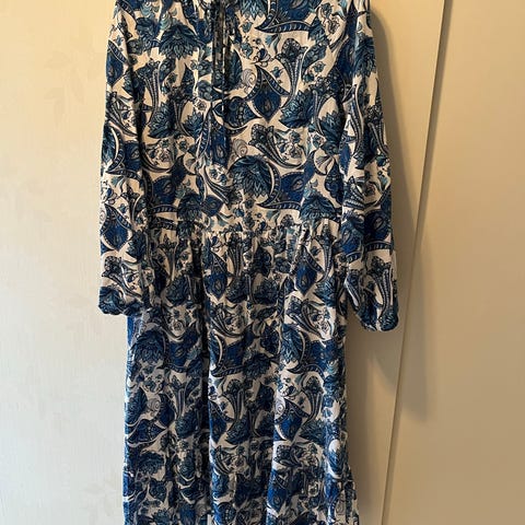 Lite brukt! maxikjole med volanger og blomstermønster i sort. Flatterende i fasongen. Størrelse 46, men kan passe både XL og XXL pga strikk i livet. Nypris 599 kr.