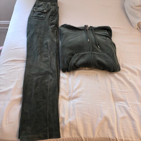 Juicy Couture bukser i størrelse S, laget av mørk grønn fløyel. Brukt 1 gang. Ingen bruks merker. Har også jakken i str M. Helt ny. 500,-