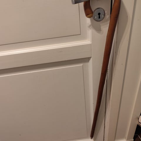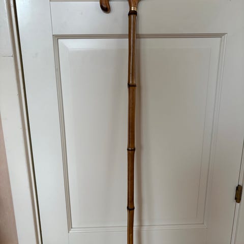 Gåstav laget av bambus med naturlig tekstur og buet håndtak. Staven har en gummiprop i bunnen for bedre grep og stabilitet. Passer til støtte ved gange. Julegave.