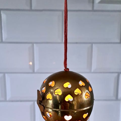 Stemningsfull telysestake i messing. Denne kan henges opp om ønskelig. Den blir ganske varm så må brukes med forsiktighet. Fin til jul, men funker hele året. En liten bulk øverst, ellers veldig fin stand. 12x10 cm.