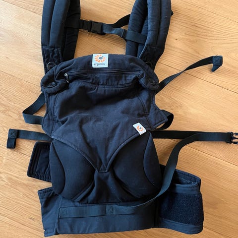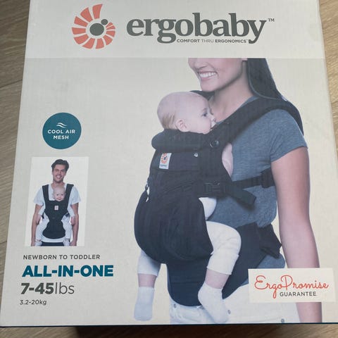 Pent brukt Ergobaby Omni 360 Cool Air bæreselesystem i fargen Midnight Blue. Bæreselen er designet for å kunne brukes i flere posisjoner og gir støtte for barnets hode når det holdes oppreist. Materialet er pustende for økt komfort.