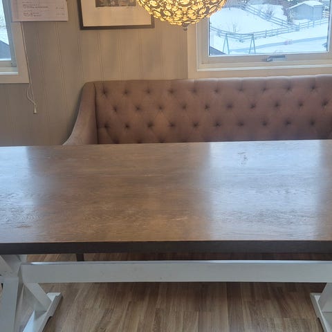 Benk til spisebord. Ca 180 cm. God å sitte i. Selges da den blir for kort til nytt spisebord. Fin og uten nupper. Flekker må påberegnes. Anbefaler og rense.