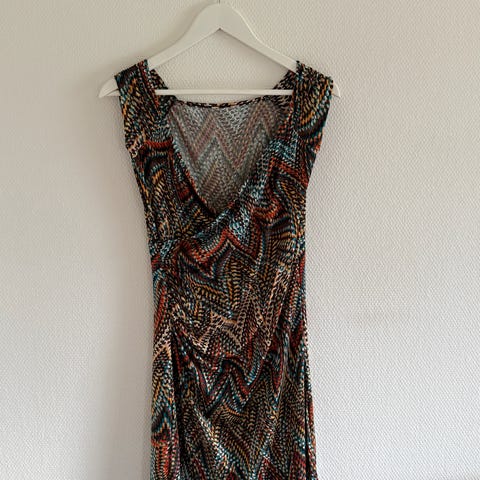 Selger en gøyal og fargeglad kjole i str M. Er nok en blanding av materialer i denne, bomull og en god del stretch. Helvig fin uten skader eller flekker☺️
