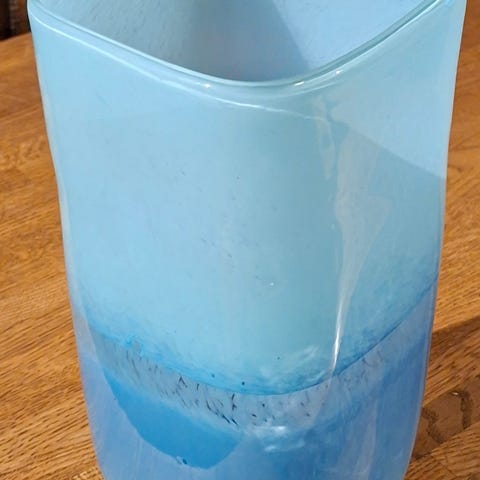 Søkeord: kunstglass kunstglassvase glass blått snowflake opalin kina china glassvase blomstervase retro vintage vtg gul rød grønn lyseblå.