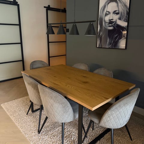 Spisebord fra IKEA og spisestoler fra Jysk, ingen bruksmerker