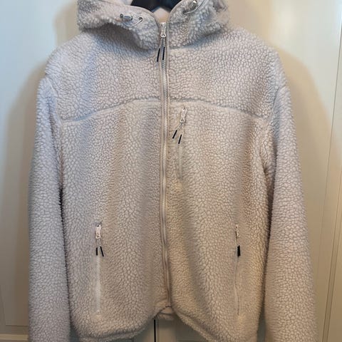 Jakka er ikke brukt. Den er grovstrikka og i en ullblandingDen er romslig i str:måler 104 over brysternærte og har en stor trykknapper, så den må ikke lukkes annet en oppeFargen er sand/ lin. . Hel lengde:90cm. Lekker med støvler og tights eller tunika / kjole.