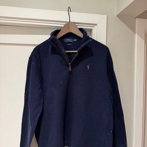 Ralph Lauren M genser i bomull, blå/grå farge. Genseren har kabelstrikkmønster og rund hals.