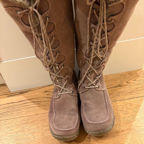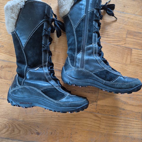 Kjøpt på xxl, kostet 1990,-. Jeg er vanlig 39,men jeg ønsket å ha en såle inni derfor kjøpte jeg de litt større iogmed at det er til vinterbruk. Skoen er fin og de anbefalte den iogmed at jeg alltid blir kald på beina. Ikke noe feil med skoen,bare jeg som ikke klarer å venne meg til høyden på skoa,så derfor selges de. Se siste bilde,ser ut som sjoller, men har ikke noe betydning for skoen. De er svært lite brukt. Det blå under skoen skulle gjøre sånn at en hadde bedre grep på isen .