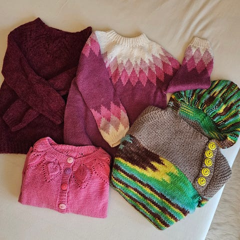 Pent brukte hjemmestrikka klær, 1 ullgensere og 2 ullbuksere (med stramming i livet). (Den ene buksen e ikke hjemmestrikka). str 2-4 år