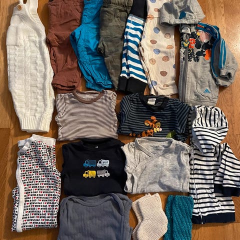 Stor klespakke til gutt i str 68. Se bilder. Helt og pent brukt, bortsett fra 4 bodyer med anmerkning som følger med om ønskelig.