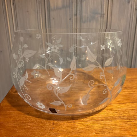 Magnor retro krystall (punsje-) bolle i serien 'Taffel' fra 70-/80-tallet. Bollen er i blyfritt krystall og har håndmalt dekor i dus grønn, blå og dyp rosa. Til bollen følger lokk og en flott øse. Dette er egentlig en punsje-bolle, men egner seg godt til servering av f.eks. salat eller kald suppe.