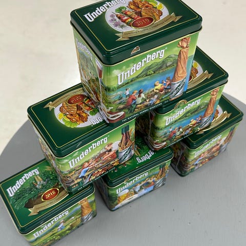 Freia Twist sjokoladeboks i metall med dekorativt motiv av marsjerende musikanter og bylandskap. Boksen er rund og har fargerike bilder på lokk og sider.