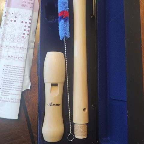 Treblokkfløyte laget i tre med flere fingerhull for tonekontroll. Instrumentet er håndlaget med dekorative utskjæringer og har en naturlig trefinish. Egnet for musikere som ønsker et tradisjonelt blåseinstrument.