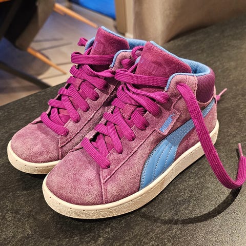 Puma barne sko for jenter i størrelse 32. Skoene har en rosa farge og kombinerer tekstil og syntetiske materialer. De er utstyrt med borrelås og snøring for enkel tilpasning og bruk. hentes i Fetsund.