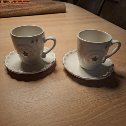 Pent brukt kaffekopp og en melk kanne. Kun henting.