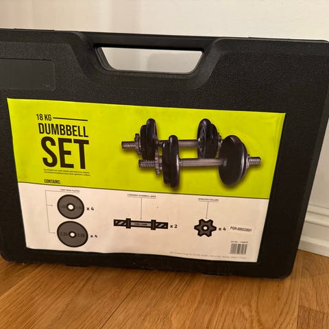 Dumbbell sett med flere vektskiver, to håndvekter og en stang. Vektskivene og stengene er i metall med sort finish. Settet leveres i en boks for enkel oppbevaring og transport. 13,6 kg til sammen