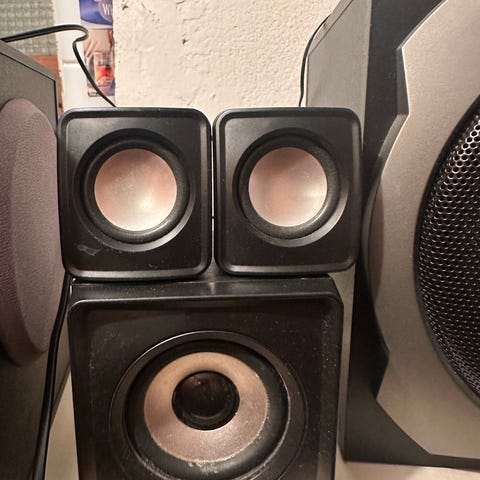 Deltaco høyttalersett i hvit farge bestående av to satellitthøyttalere og en subwoofer. Høyttalerne har justeringsmuligheter for volum, diskant og bass. Inkluderer tilkoblingskabler.