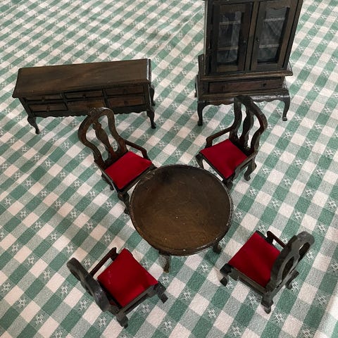"Møblementet" består av et bord, en stol med armlener, to stoler med rygg og en gyngestol. Det representerer et flott håndarbeid, laget for ca 60 år siden, og har vært tatt godt vare på. Et par av stolene har en liten reparasjon.