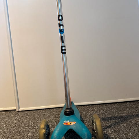 Micro Mini Micro 3-hjuls sparkesykkel med sete i blå farge. Setehøyde på 26 cm. Egnet for barn fra 36 måneder og oppover. Maksimal belastning er 20 kg med sete og 50 kg uten sete.