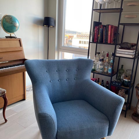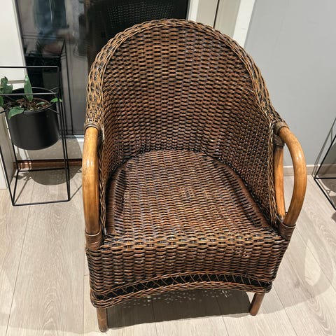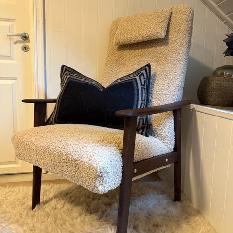 Stolen er stabil og i god stand, men trekket kan trenge en god rens, eller stolen kan trekkes om. Vi har hatt den i stuen som den er. Stolen er i hvert fall 60-70 år gammel.