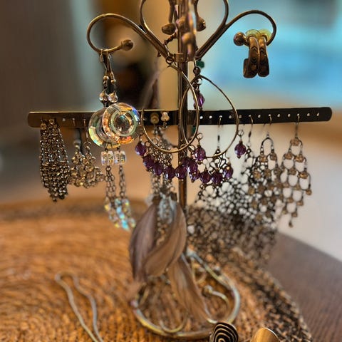 Hvitt smykkestativ/oppheng formet som et tre. Elegant og praktisk smykkestativ/oppheng formet som et tre (smykketre). Perfekt for å organisere og vise frem smykker som halskjeder, armbånd, øredobber og ringer. Bidrar til å forhindre at kjeder floker seg. Mange grener gir god plass til å henge opp diverse smykker. Har en stabil rund base/ben.