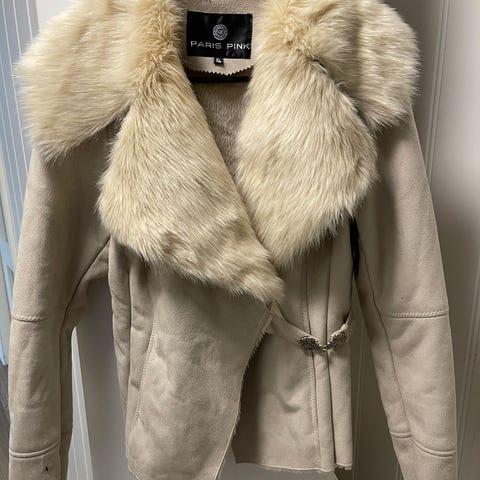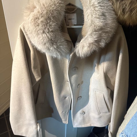 Kort omslagsjakke med deilig fôr. Lys beige.