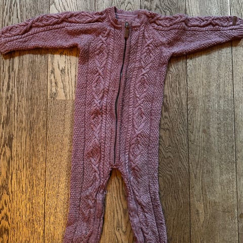 Fin bukse med strikk i livet og genser med to knapper i halsen.