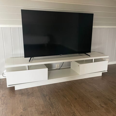 Selger et pent brukt og klassisk TV møbel - vegghengte skap. Møbelet har et stilrent uttrykk med beige fronter, messingpartier og åpne nisjer som gir et eksklusivt preg. Perfekt til TV stuen.
