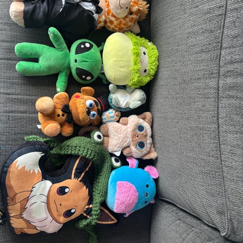Pokémon kosedyr bestående av fem ulike figurer. Laget i stoffmateriale med forskjellige farger og design som representerer kjente Pokémon-karakterer. Wobbuffet, Meowth, Scorbunny, Treeko og pokémon pyntepute.