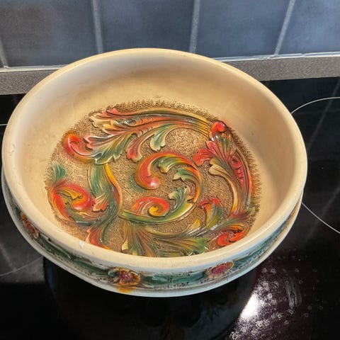 Fatet har flotte detaljer og et dekorativt bånd med skrift rundt kanten, som gir det et ekstra særpreg. Perfekt som pynt på veggen, borddekor eller som gave til noen som liker norsk håndverk og folkekunst.