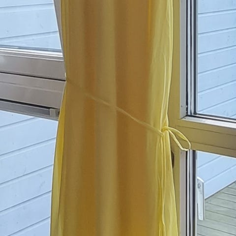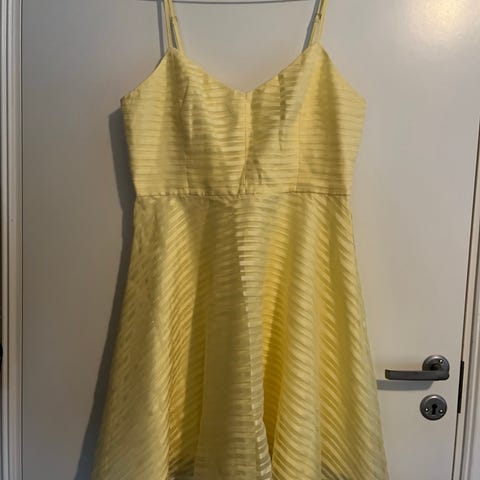 Pen kjole, aldri brukt, med lapp fortsatt på. Gul med gull-detaljer.