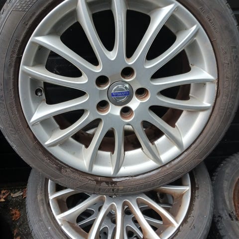 Passer for Volvo biler, brukt på SUV-modell. Hjulene har felger med en kombinasjon av svart og sølvfarge.
