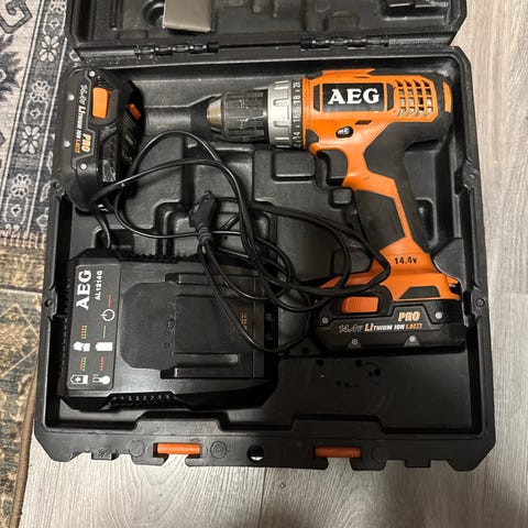 AEG drill med lader og batteri x2. Bør ha nytt batteri dersom den skal brukes til større/tyngre oppdrag.