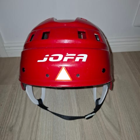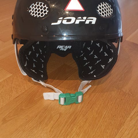 JDFA hjelm i størrelse M. Brukt når barnet var 4-5 år. Hjelmen har ventilasjonshull og justerbar hakestropp. Egnet for beskyttelse ved aktiviteter som skøyting og annen vinteraktivitet
