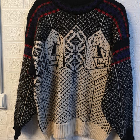 Fin, myk og god, strikket genser fra munk, med norsk flagg på armen. 30% ull, se bilder.