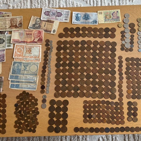 Samling av gamle mynter i ulike årstall og størrelser, oppbevart i individuelle beskyttelseslommer. Myntene varierer i design og materiale, og inkluderer flere forskjellige valører og årganger. Kom med bud. Kjøpt på Porsgrunn mynt kllubb .Skal være riktig vurdert. Kan sende flere bilder. Har også flere mynter.